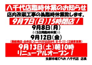 八千代店臨時休業のお知らせ!